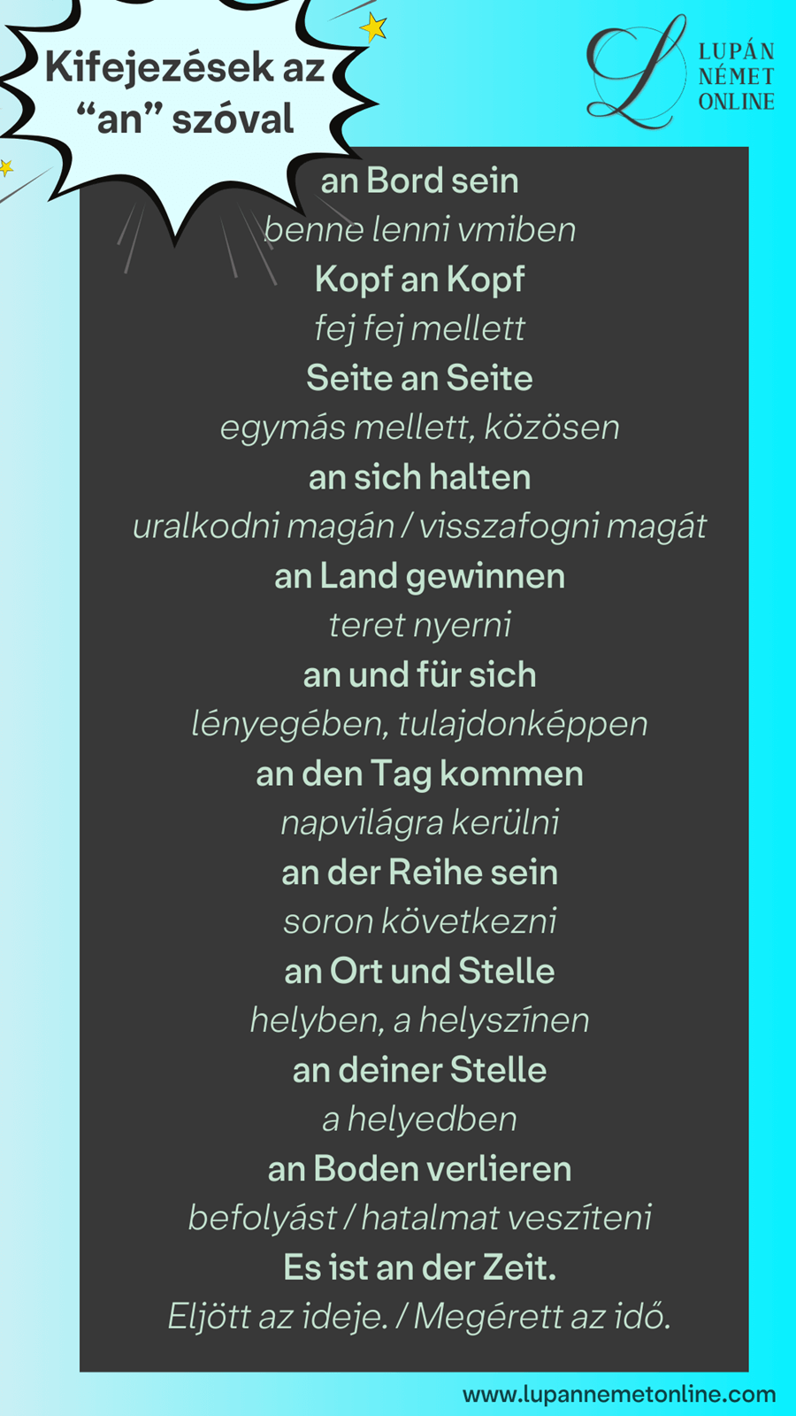 Nézzük meg, milyen kifejezések léteznek a “an” elöljáróval!