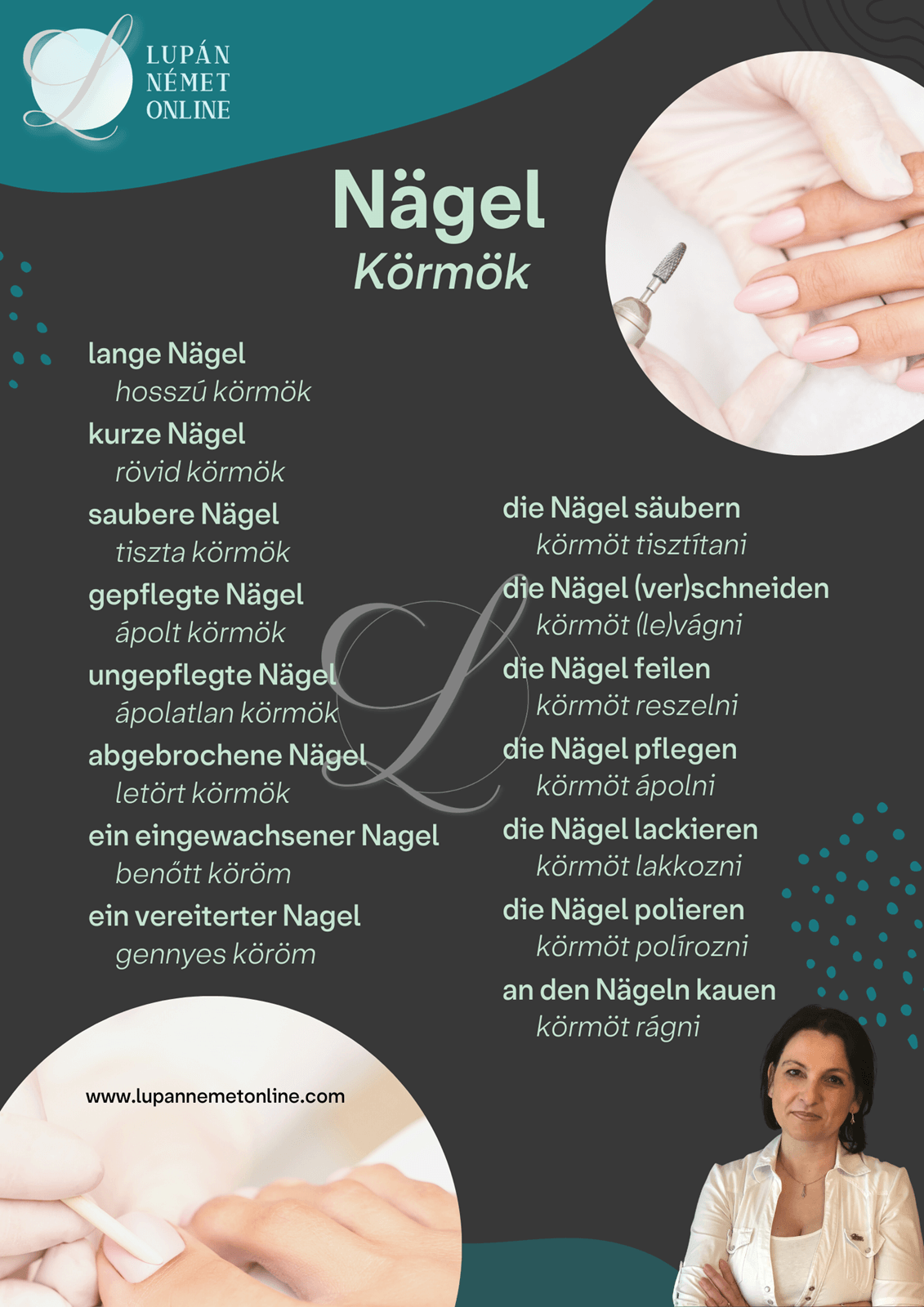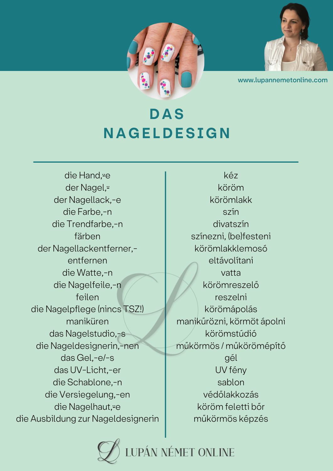 A bejegyzésben szószedetet találsz, amellyel bővíteni tudod a német szókincsedet, téma: körömápolás, műkörmösnél (Nageldesign).
