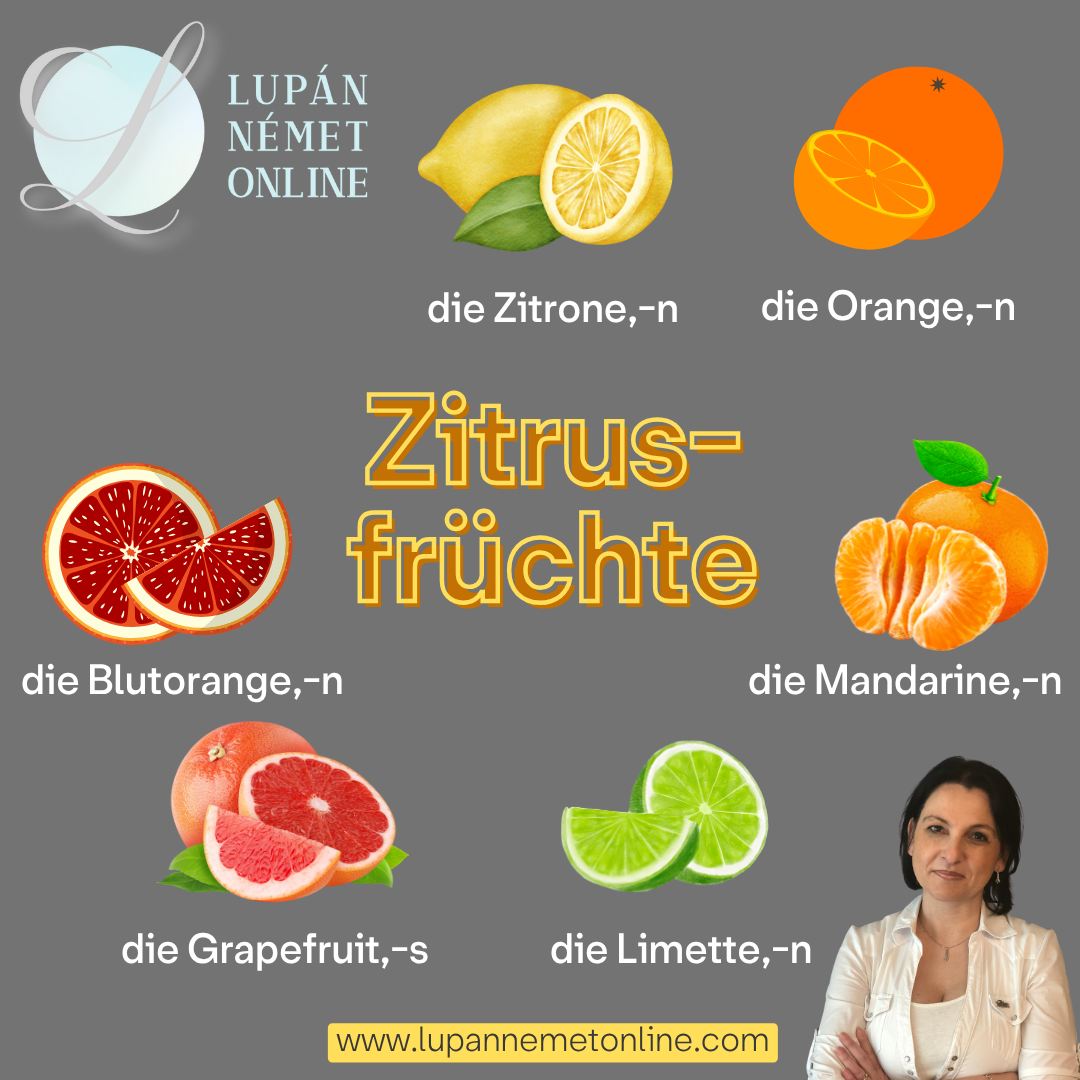 Ebben a témában a leggyakoribb citrusfélék nevét és jellemzőit tanuljuk meg németül.